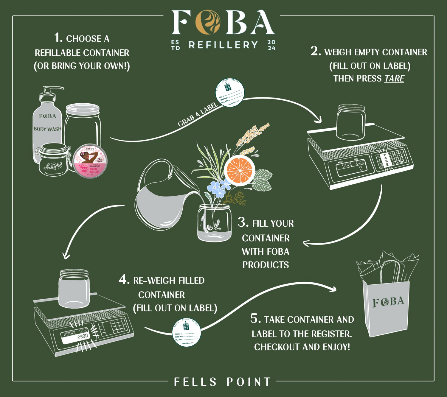 Bring your own container or purchase one from us. Refills are priced per ounce by weight. All containers should be clean, dry and ready to receive our natural products.